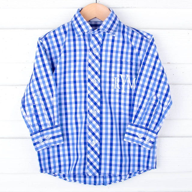Get ready for summer with our Two Toned Blue Gingham Button Down Shirt. This long-sleeve blue gingham check shirt in two colors of blue is perfect for the season and pairs seamlessly with our Summer Time collection. Consider adding a monogram for a personalized touch.