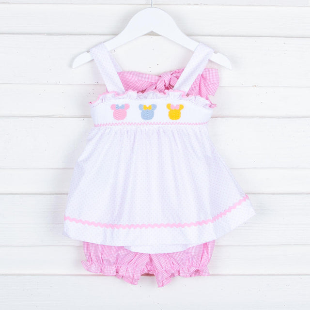 This Sweet Mouse Ears Tie-Back Bloomer Set is a perfect choice for your little one or toddler on your next magical trip! The top features charming pastel rainbow smocked mouse ears and a pink tie-back bow on white and pink polka dot fabric, paired with pink gingham bloomers.