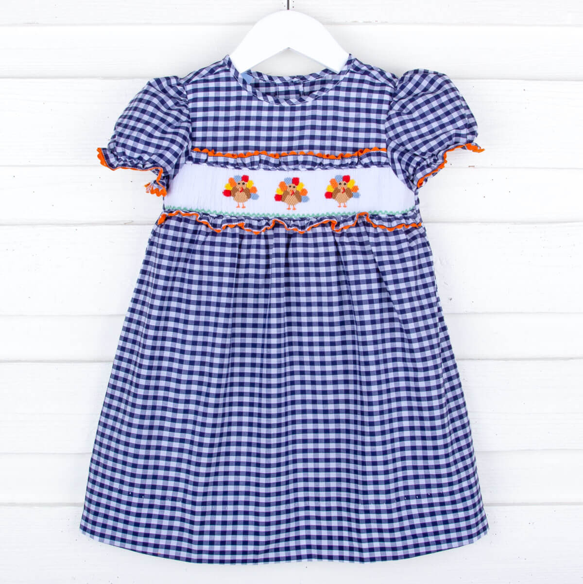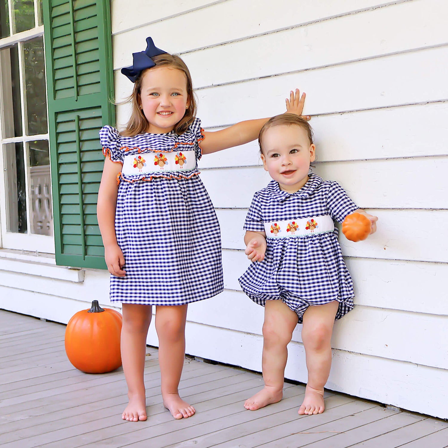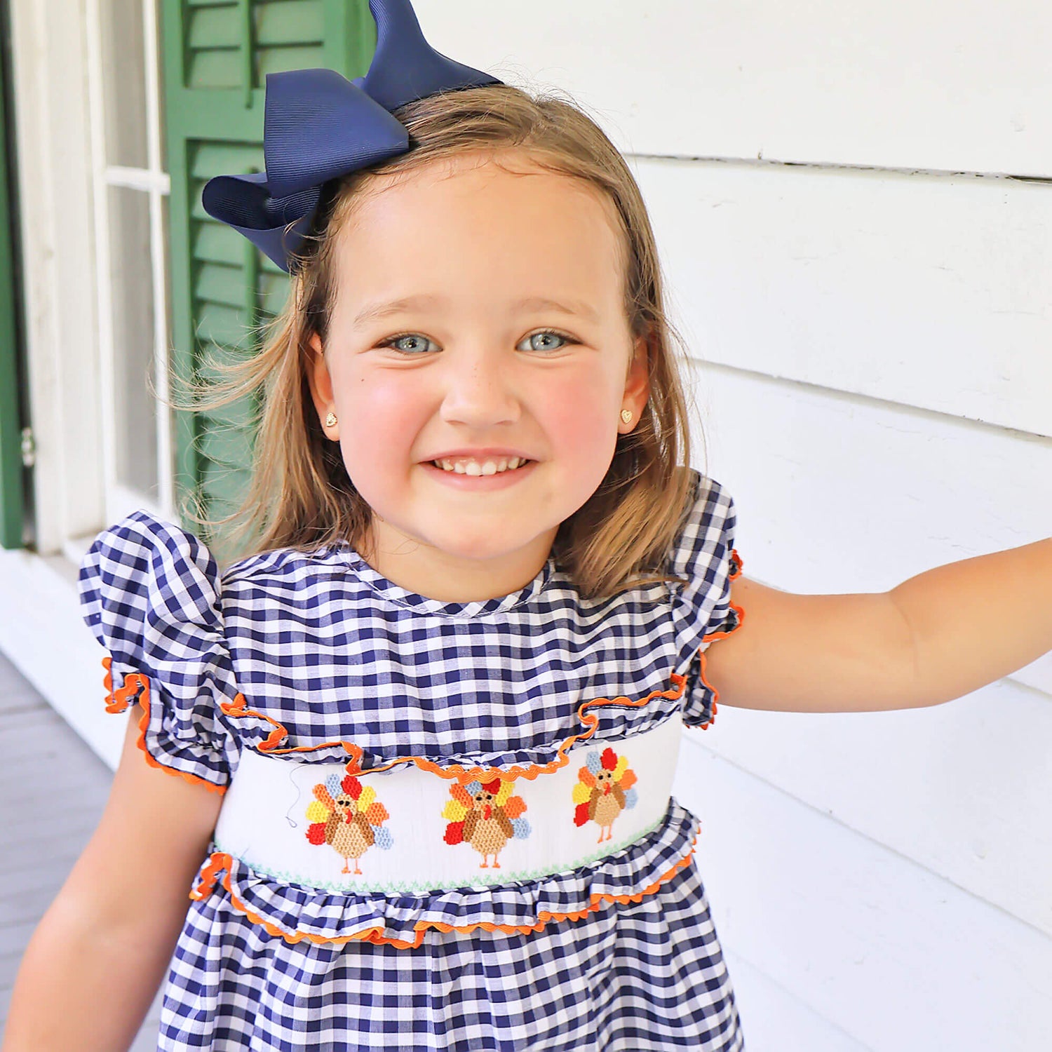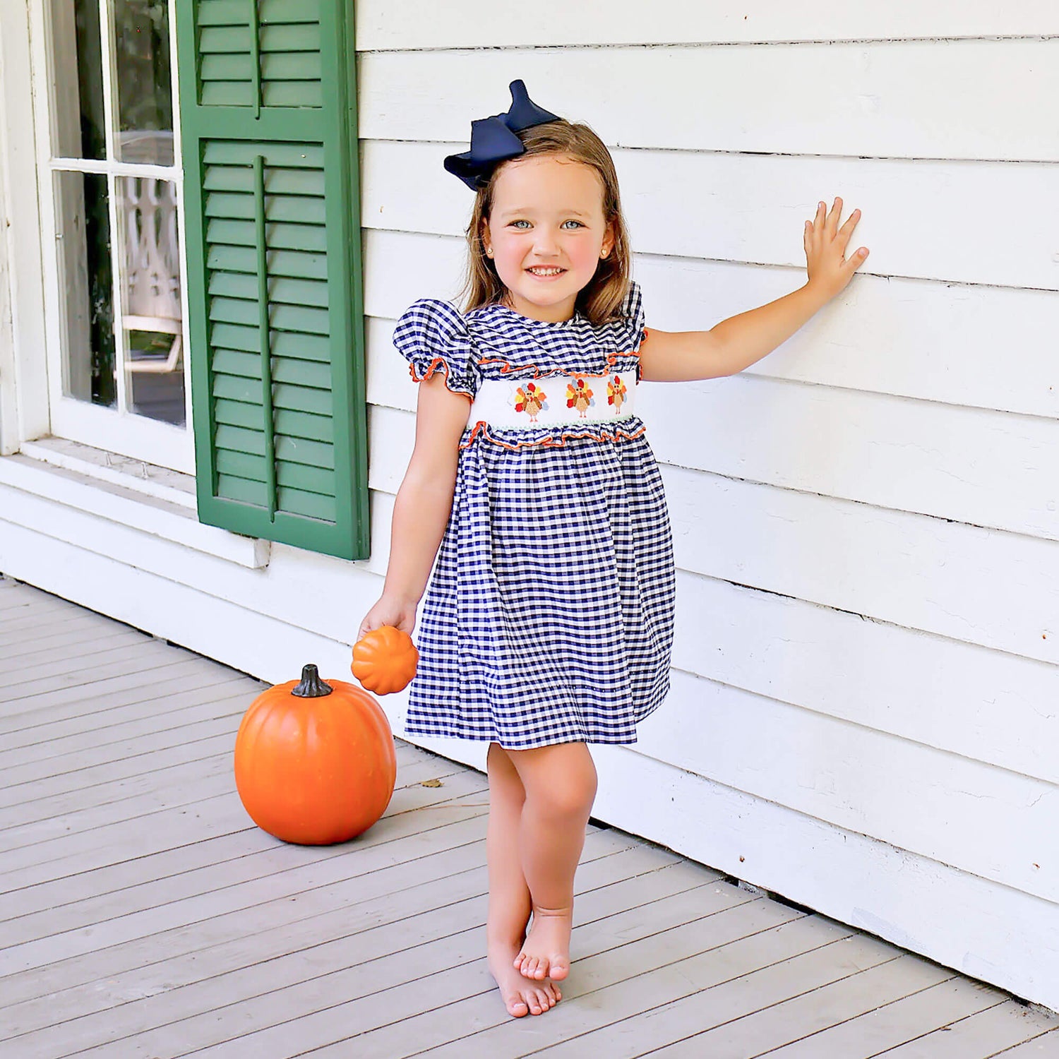 Turkey time is here! Get your little one ready to celebrate with our Sweet Turkey Navy Gingham Smocked Dress. This navy gingham dress is all set for the festive season, featuring playful bishop sleeves with cheerful orange ric-rac trim and adorable smocked turkeys. It’s the perfect choice to add some holiday cheer to your celebrations