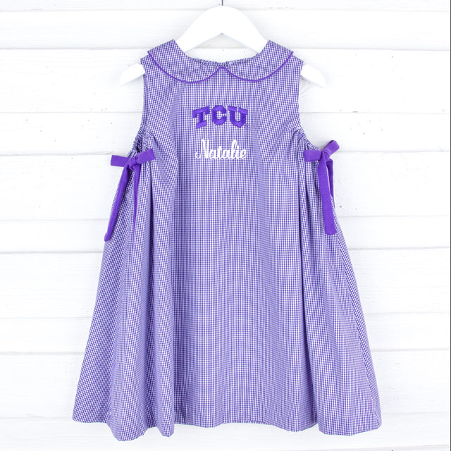 Go team! Show your spirit for Frogs with our TCU Embroidered Purple Dress. This sleeveless gingham dress features a charming peter-pan collar, and sweet red side-tie bows, all complemented by the embroidered TCU logo. Whether you're cheering from the sidelines or watching the game at home, this is the perfect outfit to support your team in style! Add a name monogram!