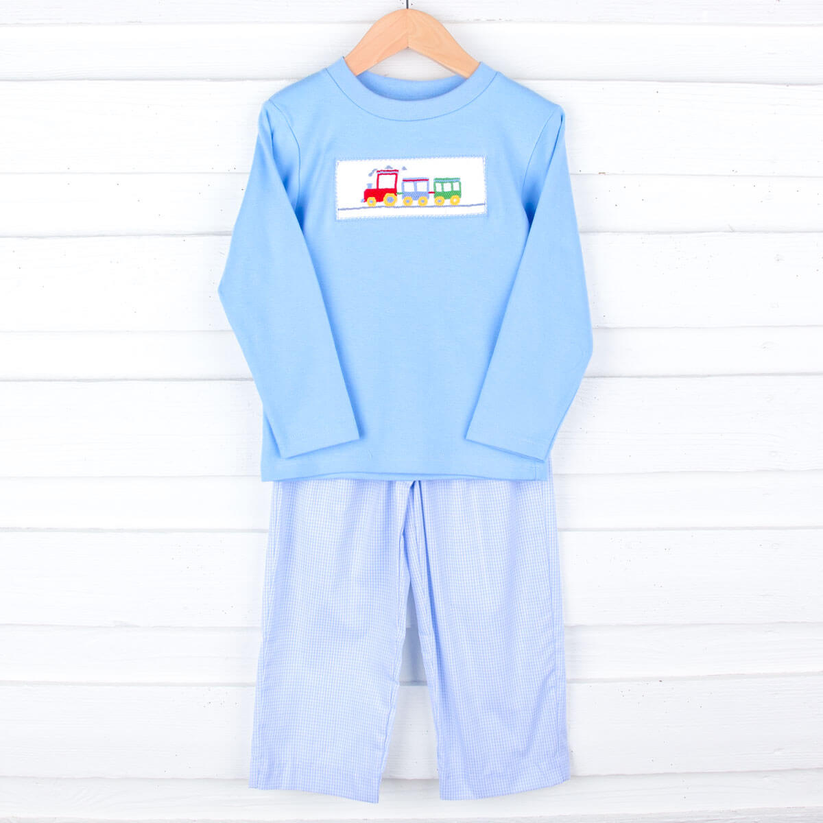 Train Smocked Light Blue Gingham Pant Set