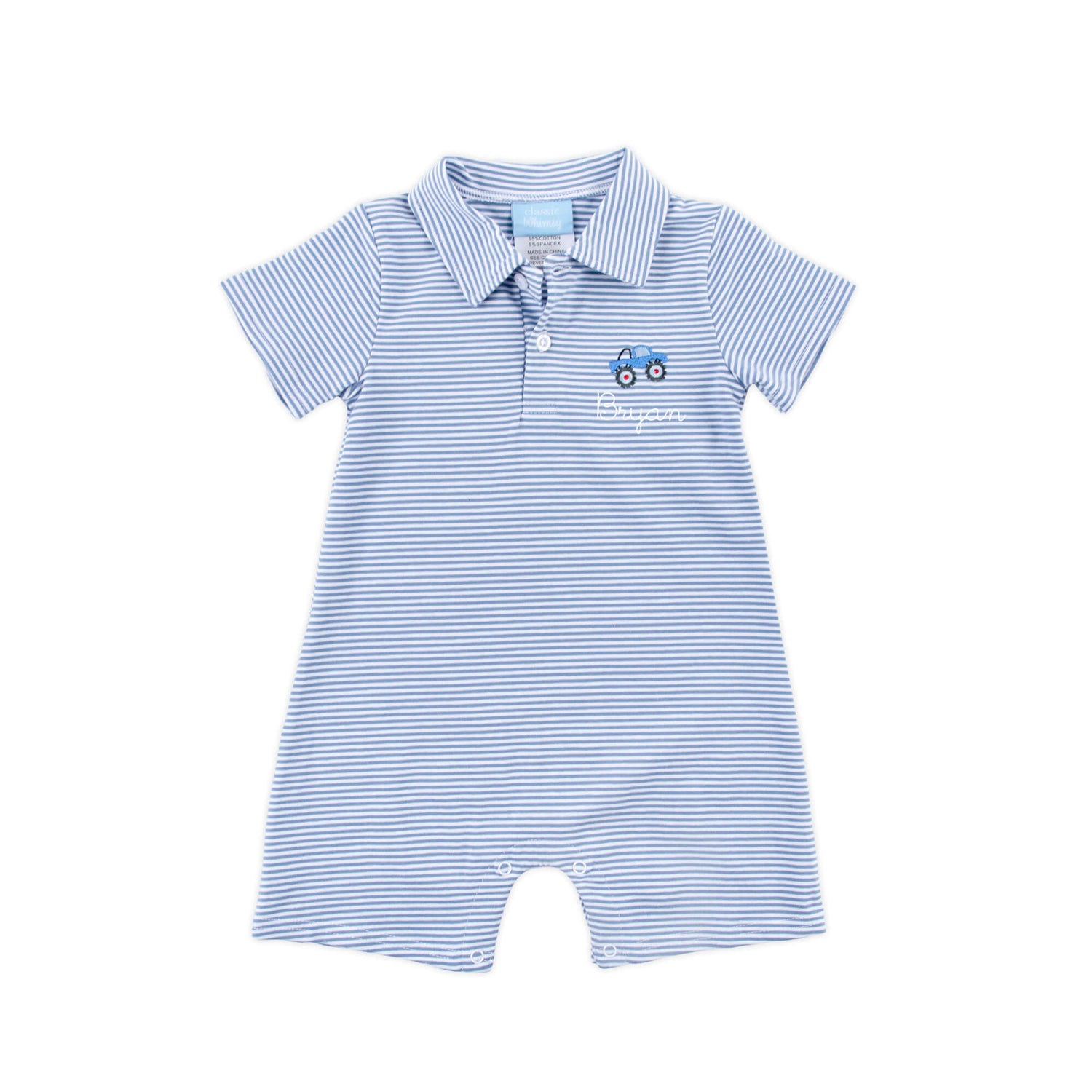 This Truck Embroidered Blue Stripe Polo Romper is perfect for playtime and everyday adventures. Designed in a soft blue stripe knit, this sweet romper features an embroidered truck for a playful touch. Snaps in stride make changes quick and easy. Add a monogram to make this outfit feel extra special.
