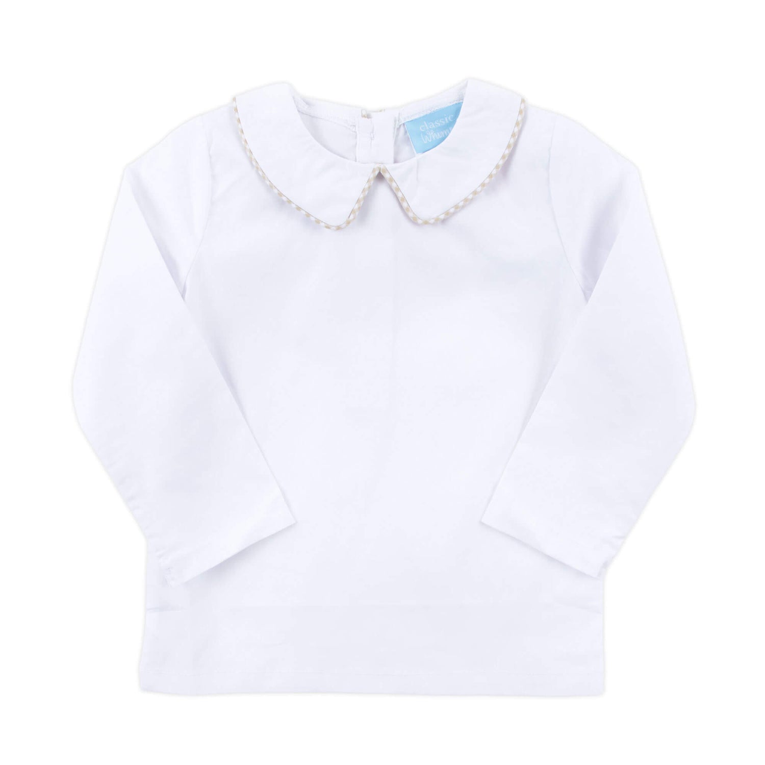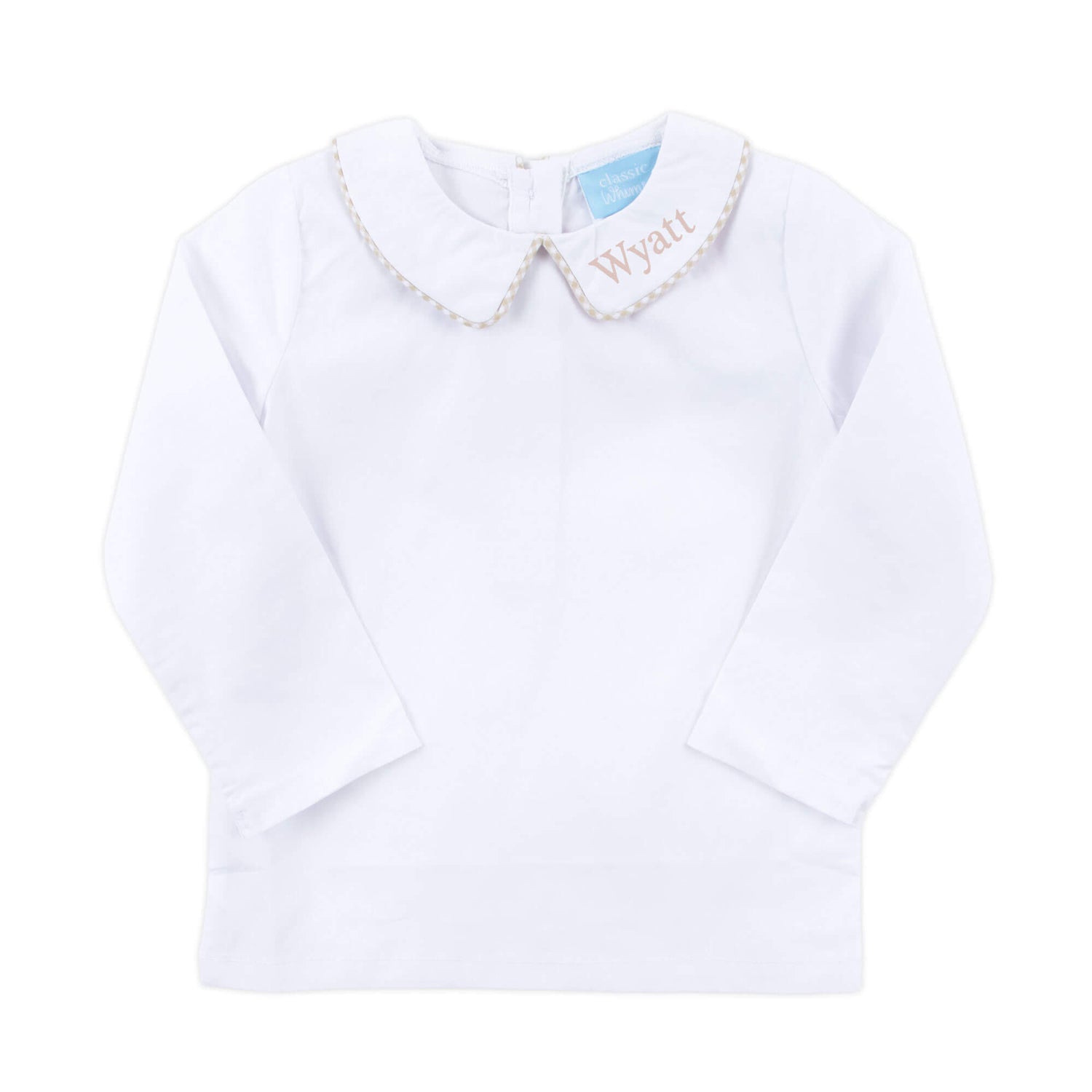 Both stylish and versatile, this White Long Sleeve Undershirt with Tan Gingham Trim is ideal for layering under longalls during cooler weather. Perfect for outings to the pumpkin patch, Thanksgiving gatherings or any special occasion, this shirt is sure to make your little one stand out. You can also add a 3 Letter Monogram and wear it alone with coordinating gingham pants or personalize it with a name on the collar to make it even more unique!