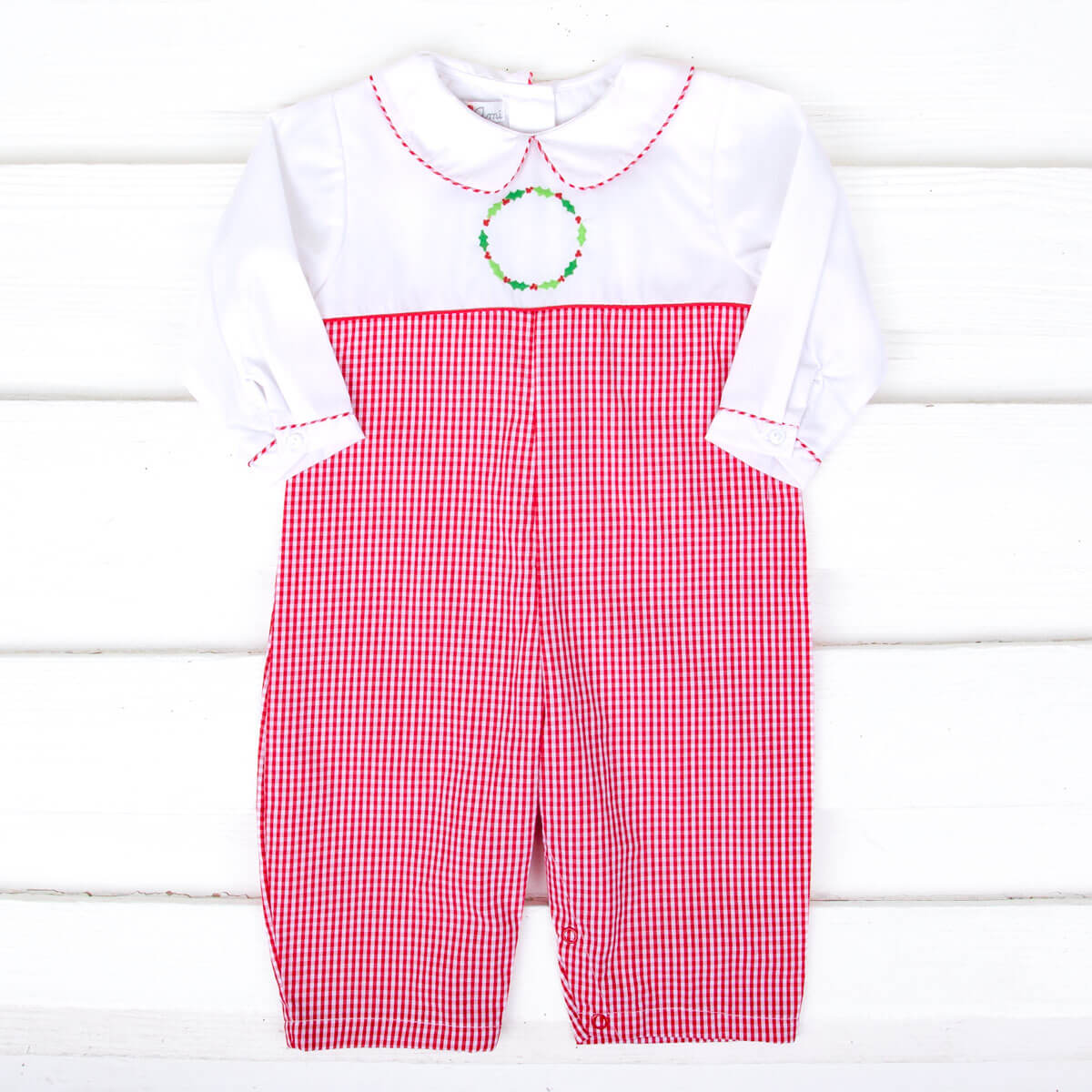 Celebrate the holidays with our delightful Wreath Embroidery Red Gingham Collared Longall! This charming red gingham longall features an embroidered wreath, perfect for the festive season. Add a monogram to complete your holiday look!